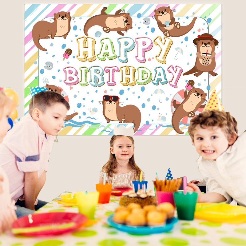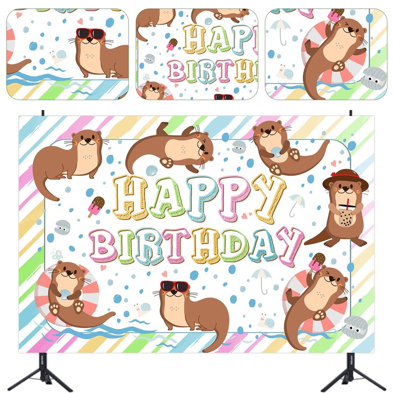 - Otter happy birthday backdrop decorations: Measuring 5 feet by 3 feet, this vibrant and colorful banner features an array of playful otters swimming and frolicking amidst a cheerful rainbow striped background. The bold 'Happy Birthday' text in whimsical lettering adds the perfect festive touch