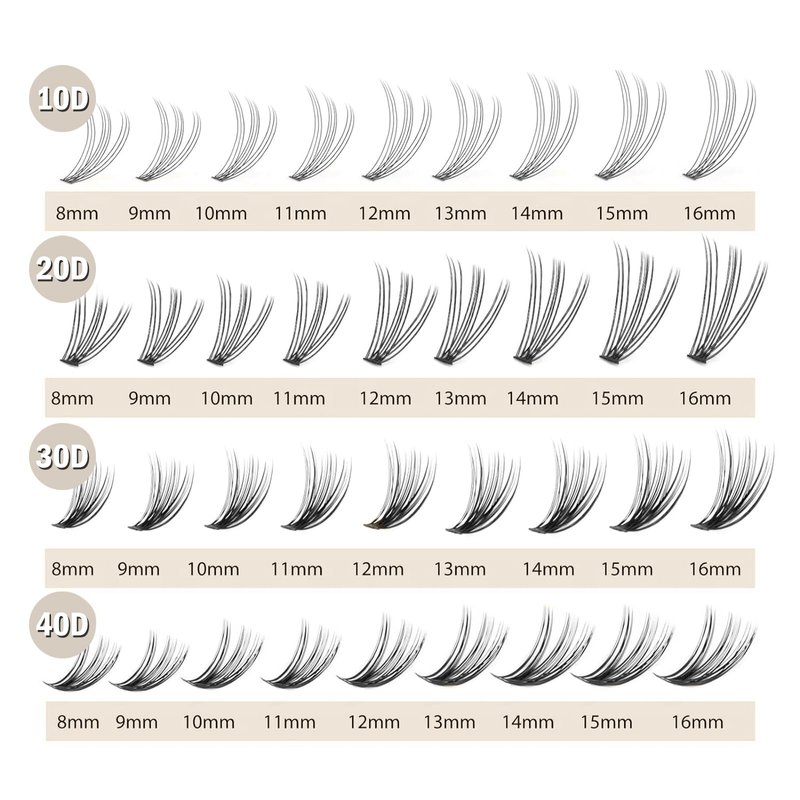 • Lash Clusters: Individual lashes, lash clusters 240 pcs 0.07mm thickness, lightweight, 10 roots, C curl, 8-12mm mix lengths, 8mm two rows; 9mm two rows; 10mm three rows; 11mm two rows; 12mm three rows