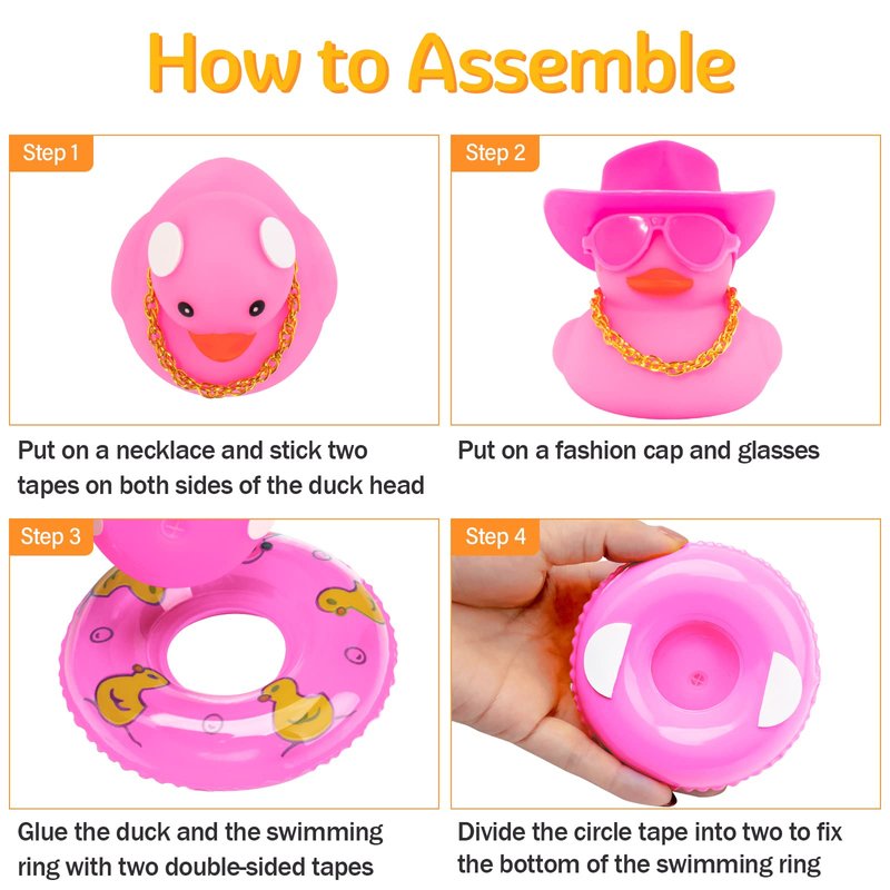 - COLORFUL DIY DUCKS - These car accessories ducks need to be assembled. Put on the necklace, wear the glasses, put the hat on the duck's head with mini tapes, and then put the duck with double-sided tapes on the swim ring, finally, use round tape to fix the whole swimming ring duck at the bottom of your dashboard. Finish! You will feel the fun of assembling!
