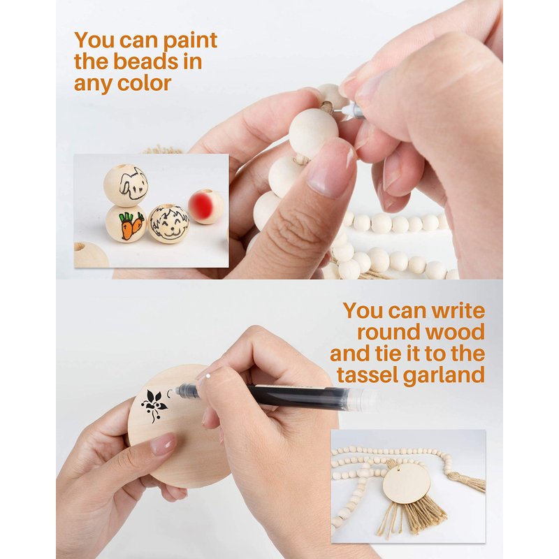 There is a 3-inch diameter blank wood circle in the package, you can write or paint on it and tie it to the tassel garland for your special wooded garland beads.