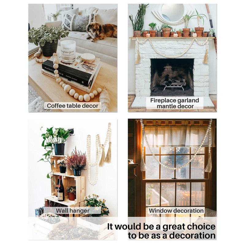 - DECORATION: the wood beads garland can be coffee table decor, bookshelf decor, fireplace garland mantle decor, draped around plant pots, candle holders or as a wall hanger