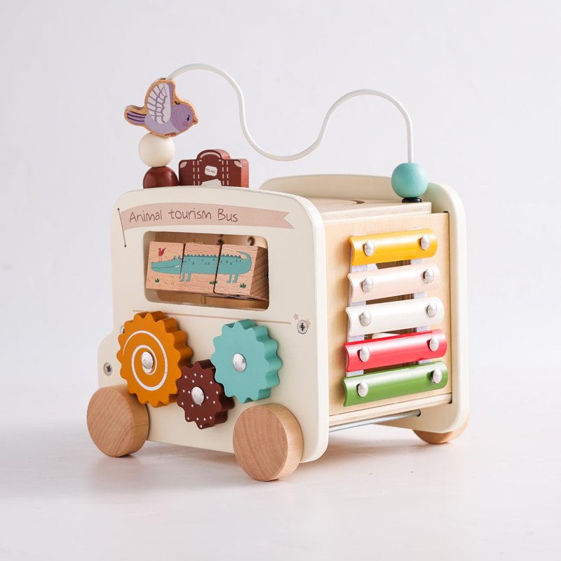 - 🚌8-in-1 Bus Activity Cube:Product size: 6.69*8.26*4.72 in.This activity cube for toddlers allows your child to play 8 games in 1 toy: Xylophone, Rotating Gears, Beaded Maze, Animal Shape Sorter, Let's Go!!! Colorful Abacus, Animal Rotating Block Puzzle, Matching Maze. Rich interactive elements allow children to learn happily while playing and go on a bus trip with the animals