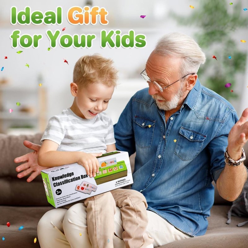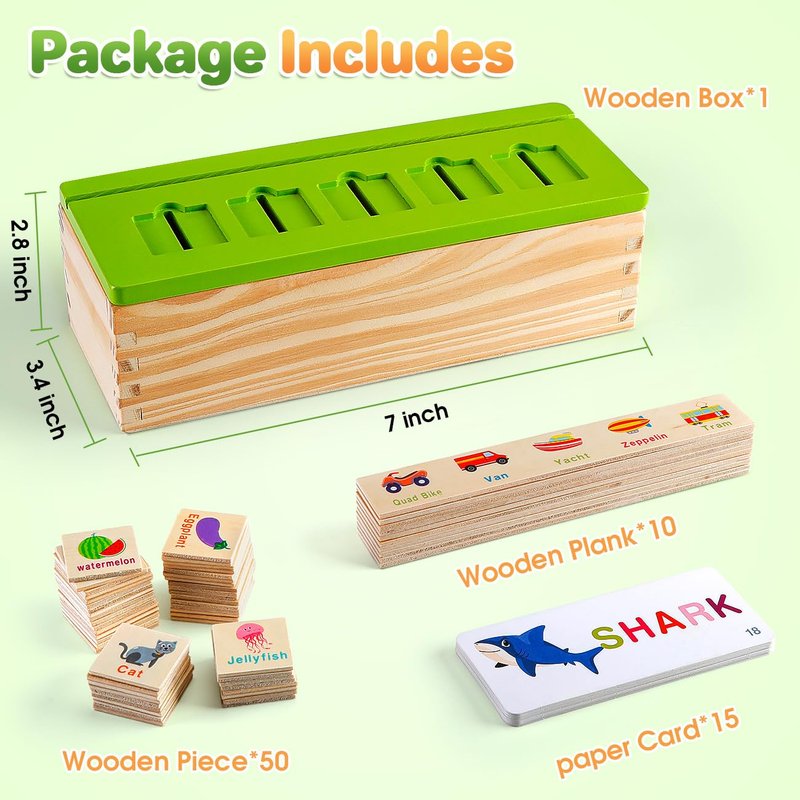 - 【Fun Learning Adventure】: Dive into a world of learning with this Wooden Knowledge Sorting Toy. Built to last, it features 15 double-sided paper cards with colorful illustrations of everyday objects for spelling prctice and 10 double-sided wooden planks for cognizing and matching items like animals, vehicles, and fruits.