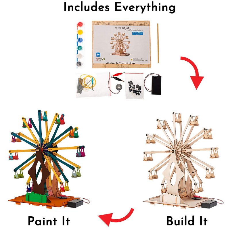 3D Puzzles for Adults & Kids with Circuits, Motors and Pulley Our building kit is the perfect toy for both adult and children! You need no additional tools than the ones provided with the kit. This mini Ferris wheel provides a fun yet educational experience for the entire family. Introduce your child to the world of STEM (science, technology, engineering, and math) with our fun and exciting tinker toys. Enhance your child’s natural curiosity and empower them with the skills they need for a bright and successful future with a real, spinning amusement park favorite they’ll adore. The perfect learning gifts for kids to help them build a solid foundation in the STEM world These STEM educational toys help develop your child's fine motor skills, hand-eye coordination, their cognitive ability, problem-solving skills, as well as working on their imagination. It also helps improve their communication skills by way of asking for help. This STEM building toy is educational even for adults by working on all the same skills. The small pieces also help you hone your dexterity during assembly. The wooden pieces of the Ferris wheel toy set can also be painted as this will add another layer of fun and creativity to the entire endeavor. You can sit with your child and paint the Ferris wheel any color you choose and truly take it to another level with your artistic skills. This way, this building toyworks both on your artistic and engineering skills as well as your creative, artistic skills.