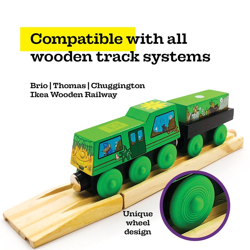 - INCLUDES 1 TRAIN, 1 WAGON, 1 PIECE OF CARGO, AND A COLLECTIBLE TRADING CARD - The train cars work on all wooden railroad curves and straight track. Add to your existing wooden train set.