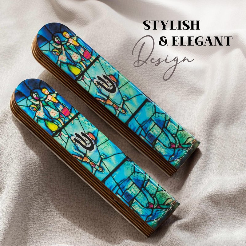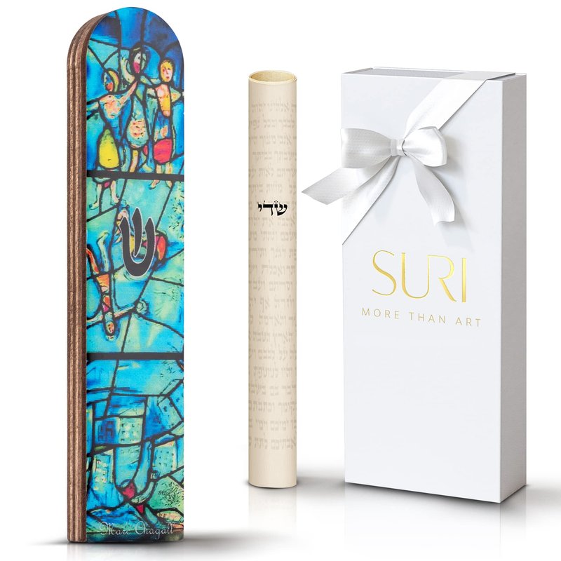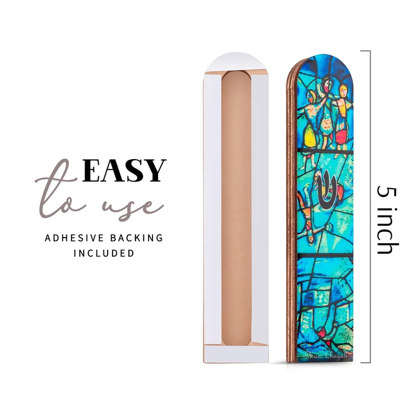 Introducing our exquisite Contemporary Mezuzah Case, a perfect blend of traditional and modern design. Crafted with high-quality wood, this elegant wooden mezuzah case will add a touch of sophistication to any doorway. Featuring the iconic Turquoise Marc Chagall Design, this mezuzahs cases pays homage to the renowned artist's captivating style, making it a stunning decorative piece for your home or office. The intricate details and vibrant colors truly bring the design to life, creating a visually appealing mezuzah that is sure to be a conversation starter. Each mezizah case comes complete with a Jewish scroll, ensuring that you have everything you need to fulfill this important tradition. While the scroll provided is non-kosher, it serves as a beautiful reminder of Jewish heritage and faith. Our mezuzah kit offers convenience and ease of use, making it simple to install and affix to your doorpost. The shin symbol, an important element of Jewish tradition, is prominently displayed on the mezuzah case, symbolizing divine protection and blessing for your home. Our Contemporary mezuzuah Case is the perfect choice for housewarmings, weddings, bar/bat mitzvahs, or any special occasion. Its timeless design and meaningful symbolism make it a thoughtful Jewish gifts for home that will be cherished for years to come.