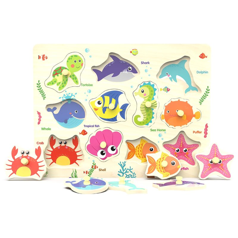 Wooden Peg Puzzle, Sea Creature Chunky Baby Puzzles, Colorful Wood Shape Puzzle Peg Board, Animal Knob Puzzle for Educational Toddlers 18 Months and Up, 11 Pieces