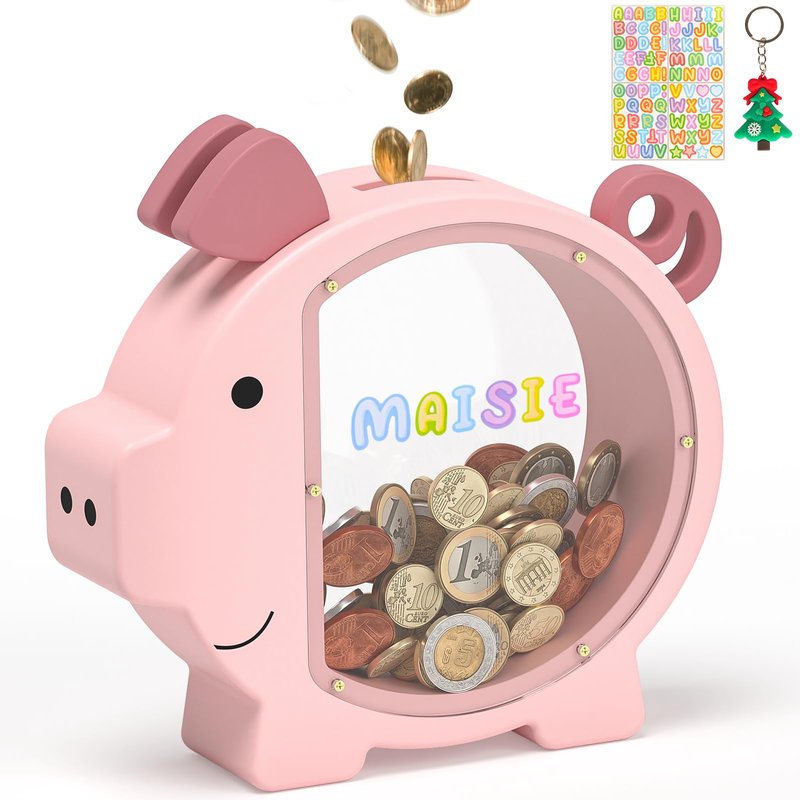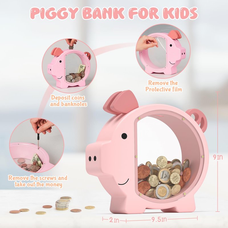 • 【Cute Piggy Design】: This kids piggy bank is the perfect money box for cash and coins, designed with cute piggy shape that appeals to boys and girls alike. It's not just a practical way to save money but also doubles as a delightful room decorations