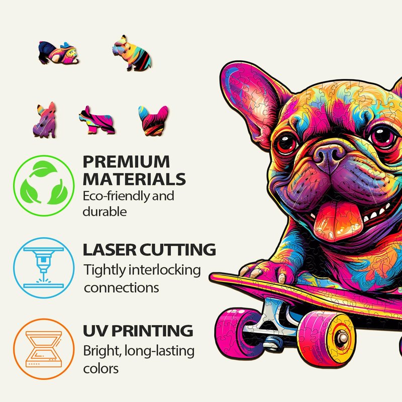 - 【Exclusive Skate French Bulldog Puzzle】Each distinctive wooden puzzle has three sizes with 70-300 pieces for all skill levels, no matter whether you are a puzzle beginner, an intermediate, or an expert
