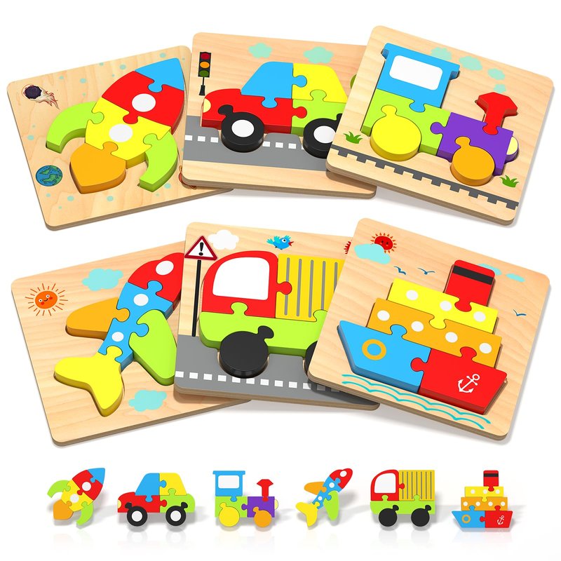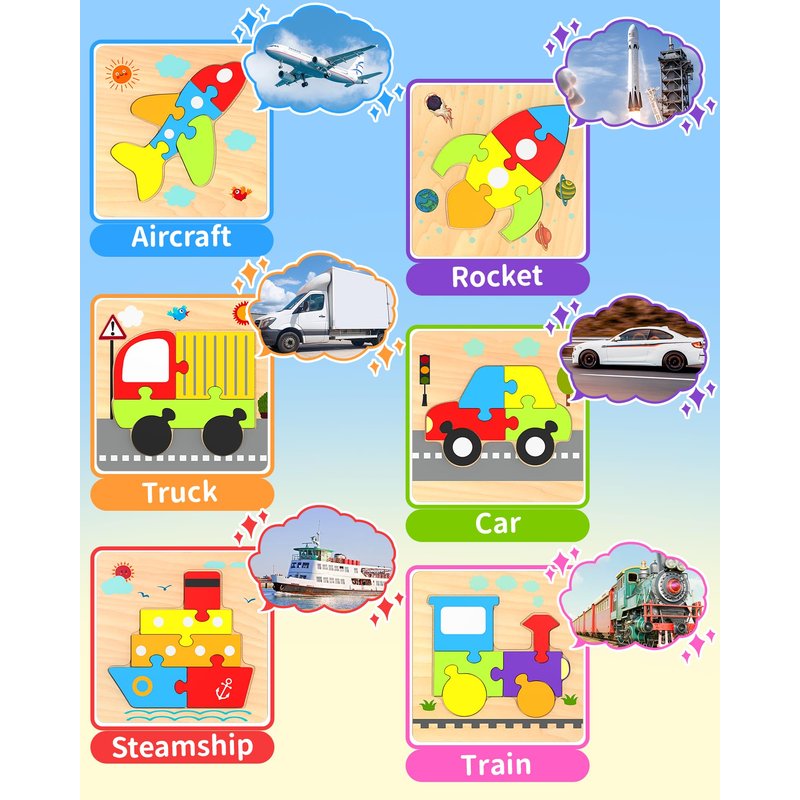 - FUN MONTESSORI TOYS: The montessori toys contain 6 pack well-selected vehicle puzzles in the air, land, and sea, it includes a car, truck, aircraft, rocket, steamship and train. Greatly encourage the development of your toddler's hand-eye coordination and attention span.