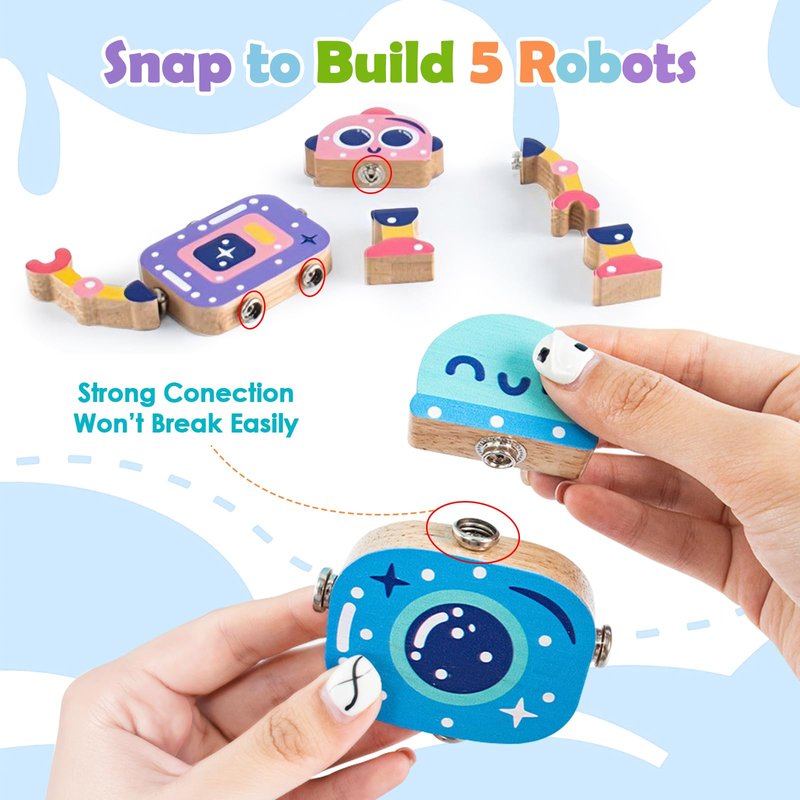 - 【Build Five Robotic Creatures】You will receive 28 pcs of wooden open-ended robot blocks.Kids can use these color-coded snap-together heads, legs, arms and to Body create many kinds of robots, also kids have the incredible opportunity to harness their vivid imaginations and blend these versatile builders together, crafting a myriad of awe-inspiring shapes!