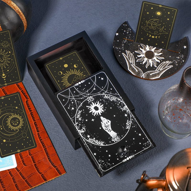 - Design of Sun and Moon: this tarot card wooden case adopts the mysterious tarot theme; Hand painted patterns of Bohemian sun, moon and stars are printed on the lid of the box and card stand; Because of the circular pendulum on the lid, it can add a mysterious atmosphere to the divination ceremony