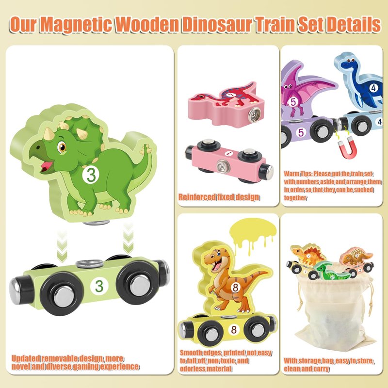 - Favorable Gift Choice for Kids 3+ Years Old: All parts of our cute and fun magnetic wooden dinosaur train set are packed in one box, and also come with a reusable portable storage bag for easy storage and travel. Our train set is a special gift for children's birthdays, daily life, Easter, Thanksgiving, Christmas, New Year, and other occasions. It is the best choice for parents and relatives to give gifts to children