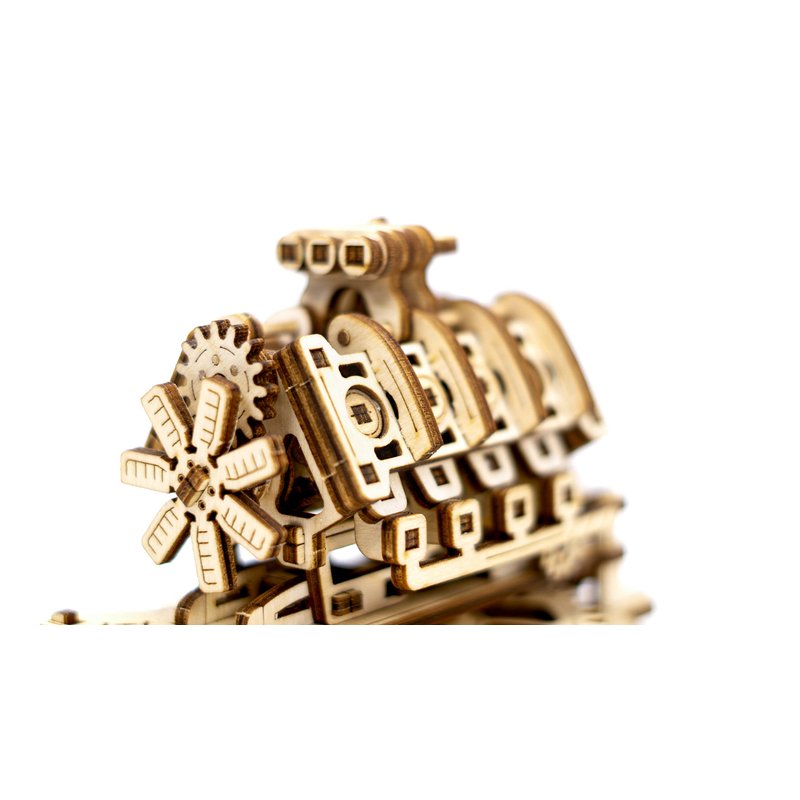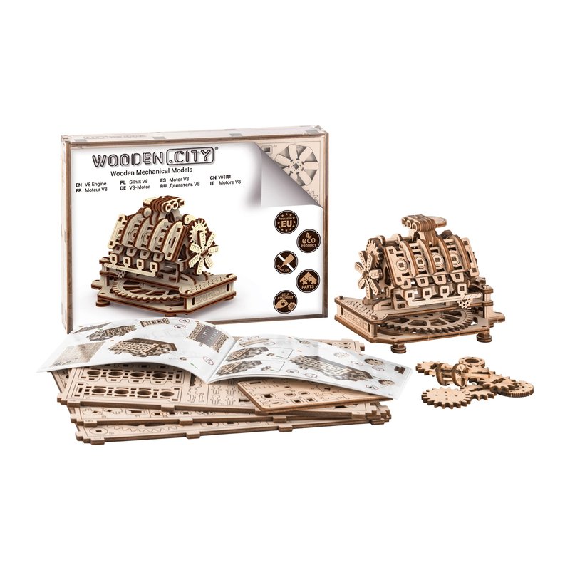 V8 ENGINE by WOODEN.CITY We present a beautiful wooden model of a V8 engine. Our wooden 3D puzzle depicting a V-shaped internal combustion engine used in racing cars. Realistic model The V8 engine is a realistic mini-model of a car engine. Invent your own engine as you assemble, our engine model leaves you feeling like you're inventing your own engine for a world-class racing car. Our "V8 engine" will be the "jewel in the crown" of your collection of wooden self-driving models. Our wooden model is made of safe and reliable materials. This 3D puzzle is assembled without the use of glue or additional tools. The kit includes everything you need. The best creative gift for adults. Is it someone's birthday? Our 3D puzzles were created just for such occasions! After folding, the model can show off in your home and be a great decoration. The V8 engine will be the best gift for any car lover. Still not convinced? Here are more reasons to have these 3D wooden puzzles: Made in Europe. Winner of the Model of the Year 2018 title. Assembly time: 2 hours. Delivered in a beautiful wooden box. Wooden Buildable Model - Wooden Mechanical Model - Birthday - DIY 3D Puzzle - Laser Cut Wooden Mechanical Models Crafts for Adults Hobby Kits FUN ADULT BUILDING MOTOR KITS