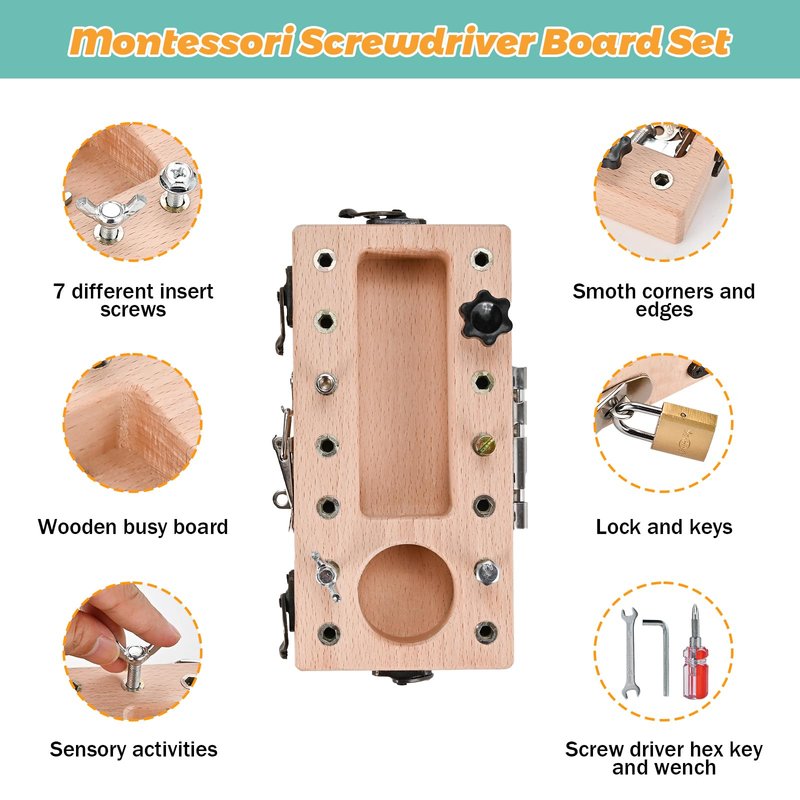 - 4.Montessori Tools for Toddlers: Our Montessori Screwdriver Board Set includes 7 styles with 14 inserted screws, 1 toddler busy board, a wrench, a lock with 2 keys, a dual-purpose screwdriver, and an L-shaped hex wrench. These Montessori wooden screwdriver toys help your child exercise hands-on skills, develop fine motor skills, and enhance observational abilities
