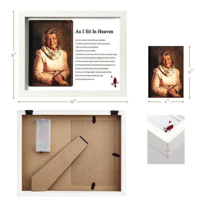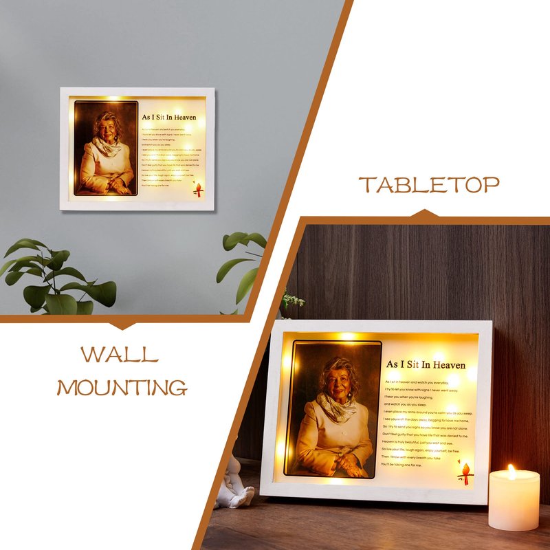 - Built to Last & Strong Paulownia Solid Wood. The shadow box frame is made of lightweight yet strong charred paulownia wood, which is resistant to fire, water and rot, the quality built in LED lights is a plus. Touching funeral poem "As I Sit In Heaven" that UV spray painted on the shatterproof glass window is elegant, clear and never fades away. It reads "As I sit in heaven and watch you everyday, I try to let you know with signs I never went away. I hear you when you're laughing, and watch you as you sleep. I even..."