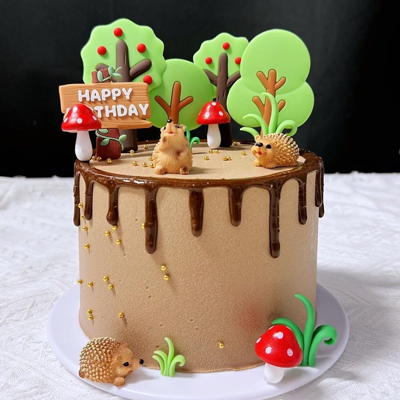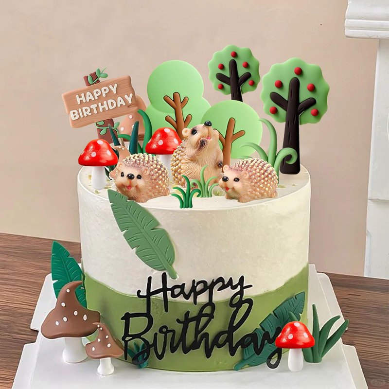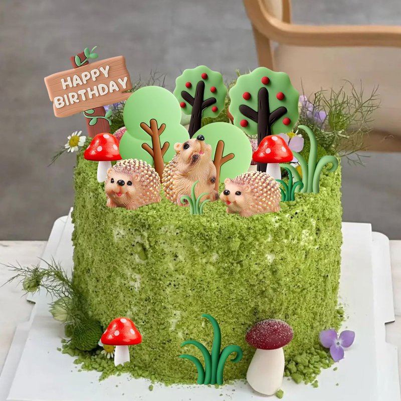 - What you will receive: 3 x hedgehogs ,3 x mushroom figurines, 4 X small grass cake toppers,4 x tree cake decor,1 x birthday cake decoration.
