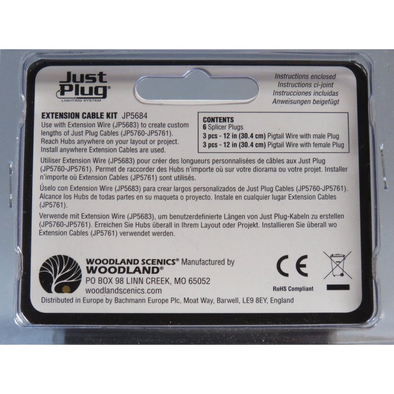 Woodland Scenics WDS 5684 JP 5684 Woodland Scenics Extension Cable Kit for Just Plug Lighting System Use with Extension Wire to create custom lengths of Just Plug Cables. Reach Hubs anywhere on your layout or project. 6 Splicer Plugs 3 pcs. - 12" Pigtail Wire with Male Plug 3 pcs. - 12" Pigtail Wire with Female Plug