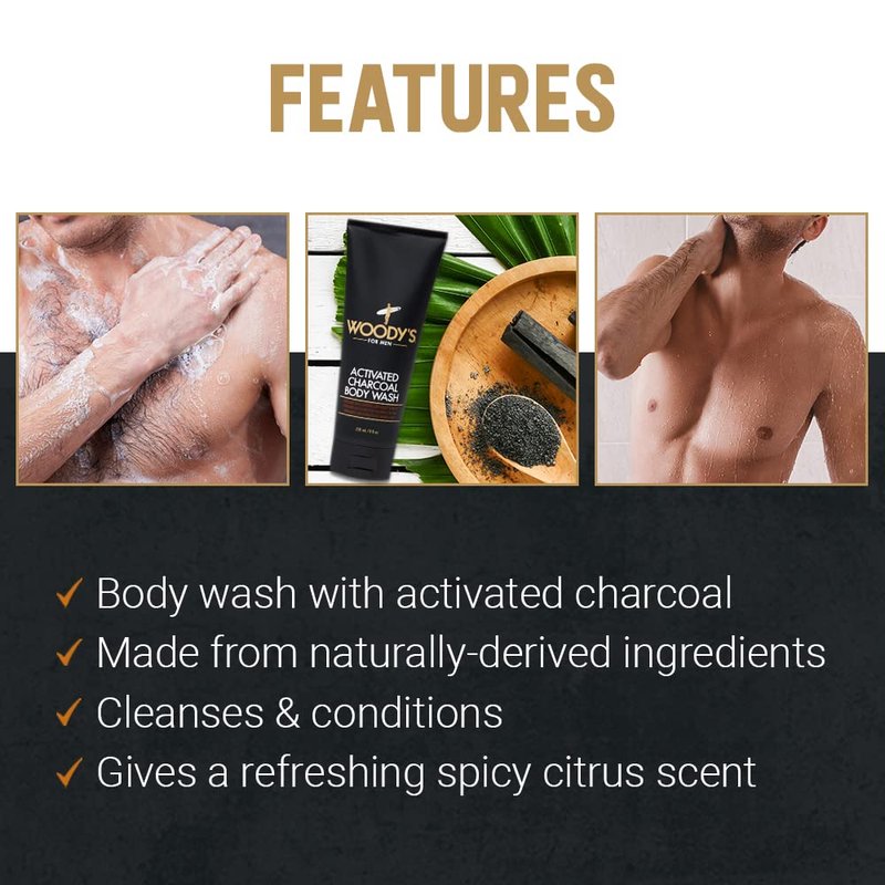Woody's Activated Charcoal Body Wash for Men is a robust cleansing solution designed to detoxify and refresh your skin. Our unique formula combines the potent impurity-absorbing properties of activated charcoal with the natural exfoliating benefits of walnut shell extracts. This body wash delivers an invigorating aroma and a satisfying lather that leaves your skin feeling revitalized and smooth after every shower. Perfect for daily use to maintain cleanliness and hydration.