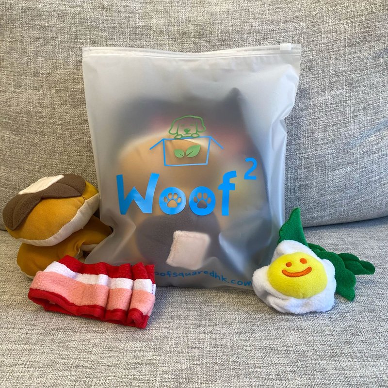 Woof² Sunday Brunch Set Soft Plush Dog Toy of 5 Parts - Pancake, Bacon, Vegetables, Sunny-Side Up Egg and Plate, Play Fetch & Hide Treats for Mental Training, Paper Crinkle Sound, Small Medium Pets