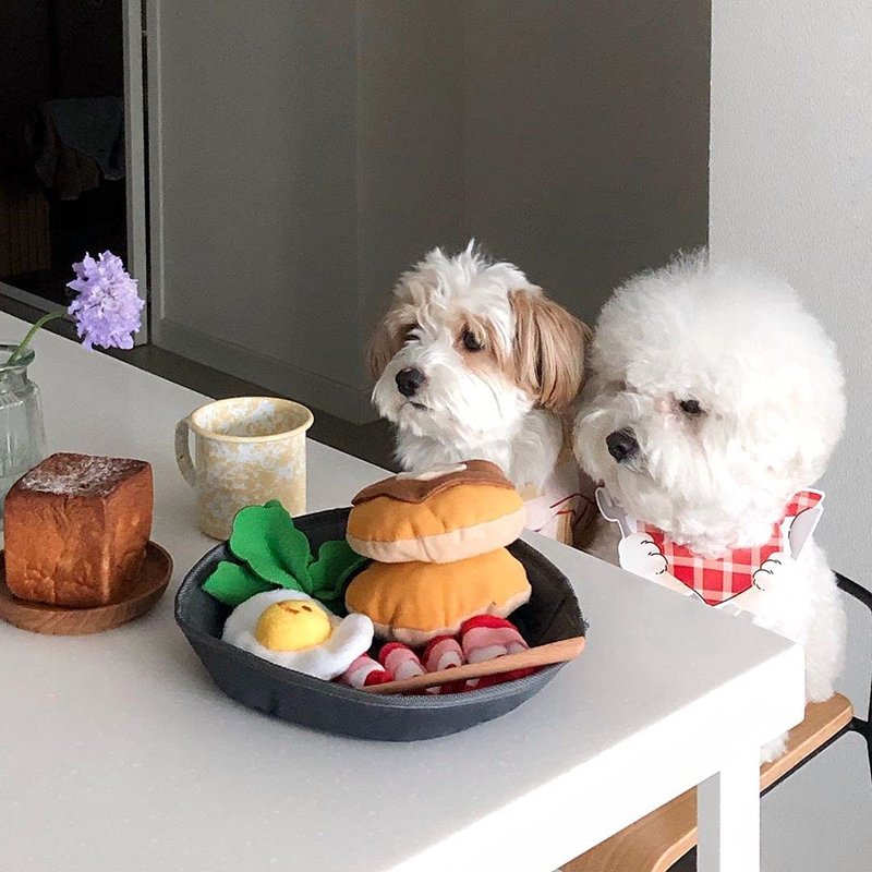 - MULTIPLE WAYS OF PLAYTIME: i) Play fetch with her with all the individual ‘food’; ii) Hide food/treats in the 'pancake' and 'bacon'; iii) Take it up a level: Hide food/treats anywhere on the plate.
