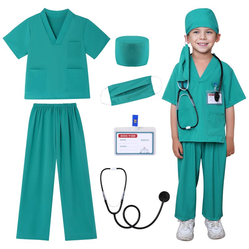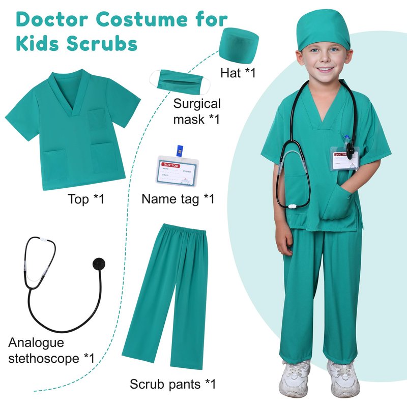 - Professional Doctor Costume Set, Realistic Experience---This doctor Scrubs 6pcs costume set is designed for kids aged 3-9 and includes a top, a pair of surgical trousers, a surgical mask, a hat, a virtual stethoscope, and a doctor's name tag. Kids can feel like real doctors with this scrubs for kids set, inspiring their interest in the medical profession.