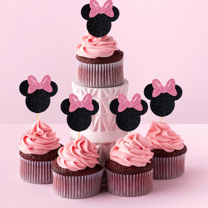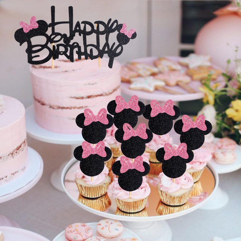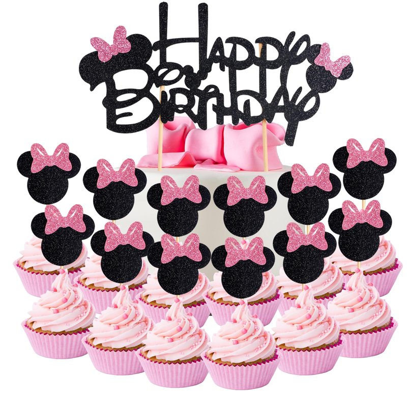 - Cute Cake Decorations: 1pc Happy Birthday cake topper, 24pcs cupcake toppers, all decorated with cute pink bows. Bring the beloved Minnie to life on your cupcakes, adding whimsy to your well-prepared party