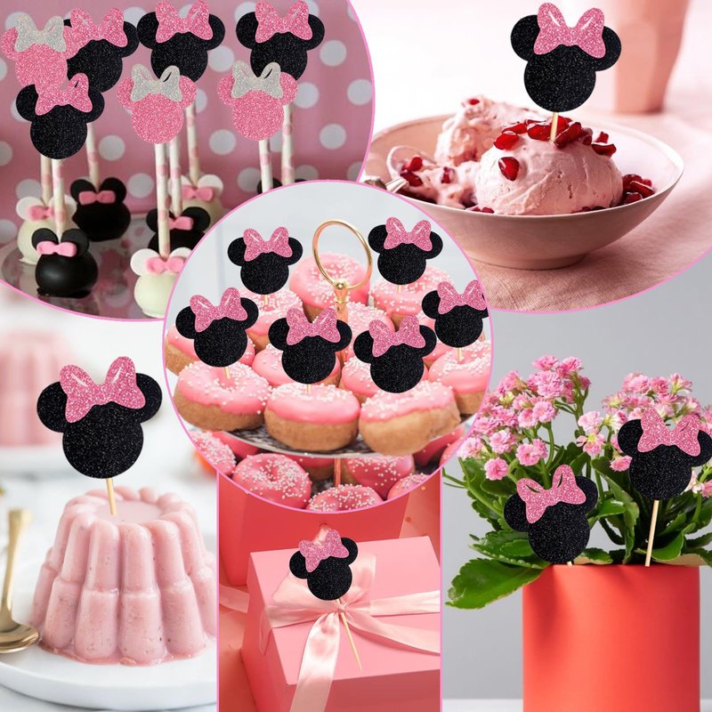 Wootkey Glitter Mouse Inspired Cupcake Toppers with Bow Black and Pink Happy Birthday Cake Topper Cupcake Picks 25Pcs Birthday Party Favors Cake Decorations Supplies