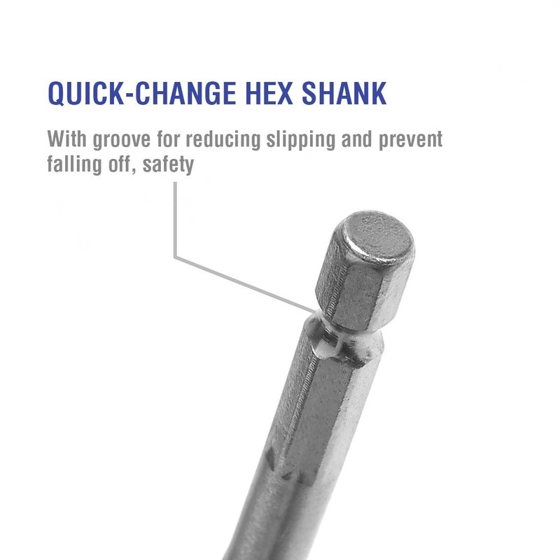 - Quick-Change Hex Shank, with groove for reducing slipping and preventing falling off, safety.