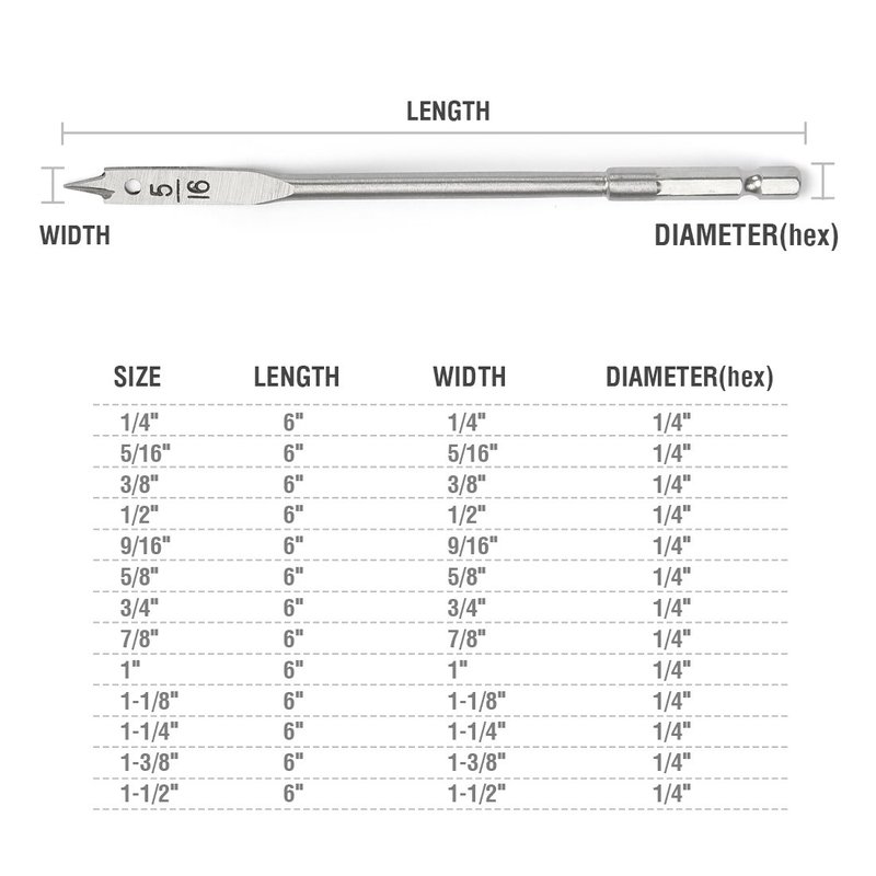 The WORKPRO 1/4" to 1-1/2" Spade Drill Bit Set includes 13 commonly used high-performance drill bits to do your woodworking. The set features double side cutting spurs that preserves nail life, the extreme speed channel for efficient chip removal, and a 1/4-inch hex groove shank for quick bit changes