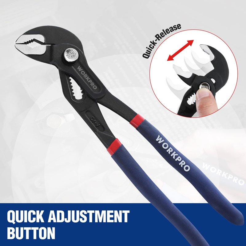 - Durable Construction: WORKPRO tongue and groove joint pliers are made from premium Chrome Vanadium steel for high strength and durability. The polished jaw and black phosphating make the pliers more corrosion-resistant, ideal for plumbers and DIY homeowners.