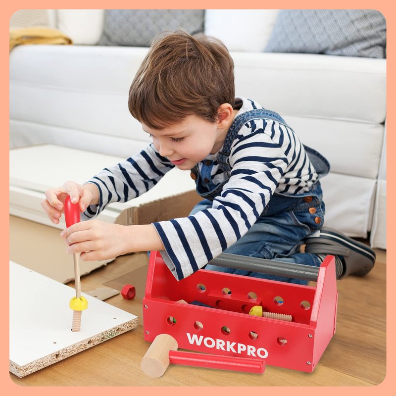 - 24-Piece Pretend Wooden Tool Kit: The Workpro Take-Along Tool Kit is a sturdy wooden tool set with 24 pieces, including a child-size play hammer, wrench, screwdriver, wooden screws, nails, nuts and bolts.