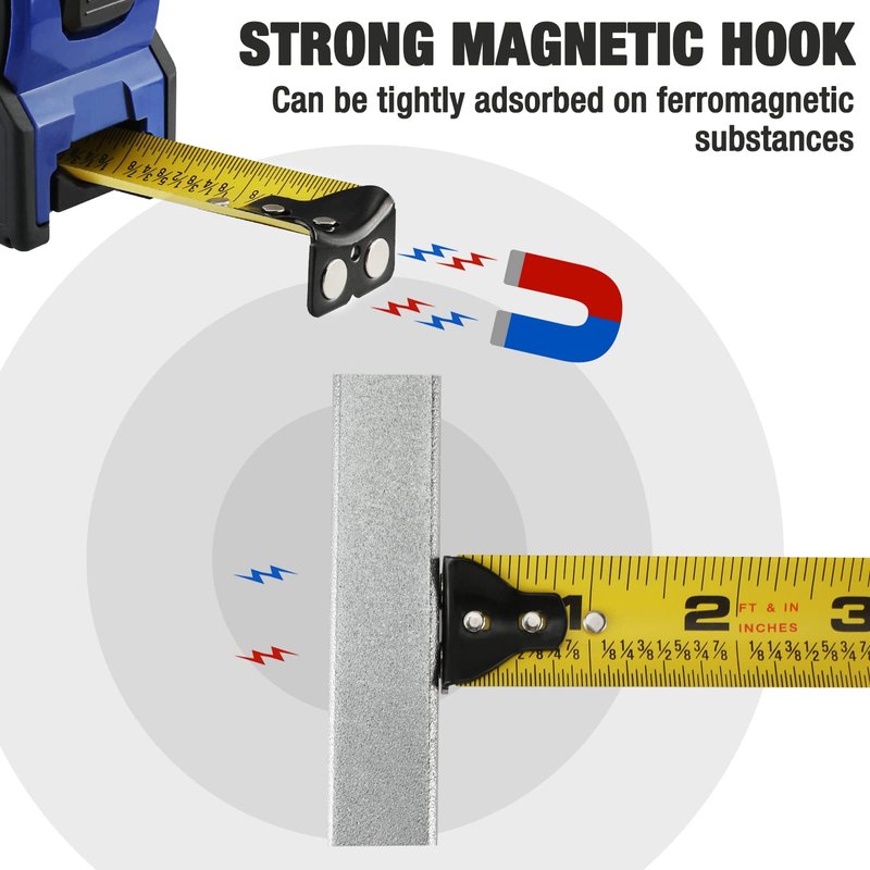 - Magnetic Hook & Thumb Lock - The end of the measuring tape is outfitted with a powerful magnet, allowing you to easily measure both non-metallic and metal surfaces. Simply attach the end of the ruler to any surface to keep it in place by thumb lock while you get the measurements you need. The thumb lock can also slow down the blade retraction speed to prevent accidental injury.