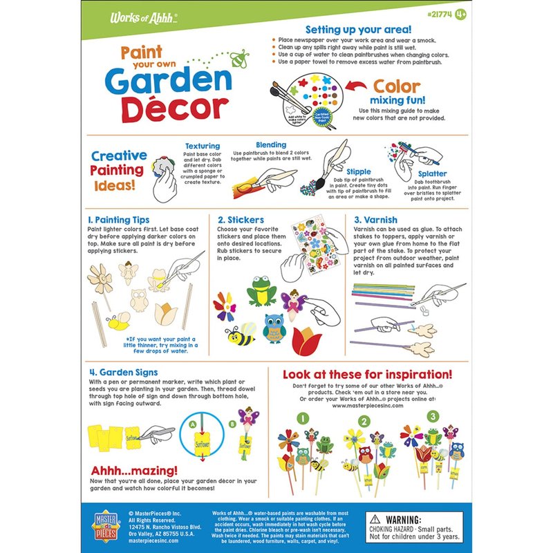 - Kit includes 6 garden toppers, 8 garden signs, 6 wood dowel stakes, 2 artist-quality paintbrushes, 5 non-toxic paint tubs, 1 non-toxic outdoor varnish tub, 1 sticker sheet & instruction sheet with painting guide