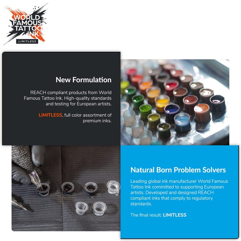 - REACH COMPLIANT INKS – Our LIMITLESS is a new REACH-compliant line for artists in Europe. The permanent tattoo ink is ultra-safe and pure. All World Famous Tattoo Inks are purified and safety sealed.