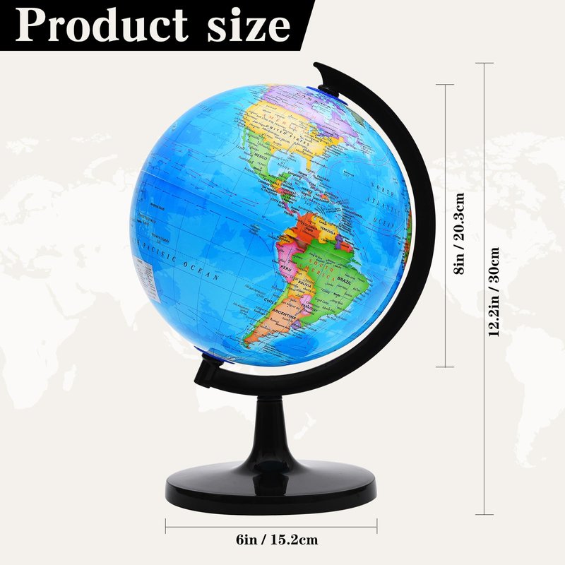 - World Globe: This world globe rotates 360 degrees around its axis. Our plug-in globe stands 12.2 inches tall (from bottom to top) with a diameter of 8 inches. The globe is made of ABS (acrylonitrile-butadiene-styrene plastic) and printed with high-quality ink, making it safe for children to handle and play with. The sturdy base prevents tipping or tilting, making it a durable addition to any classroom or home.
