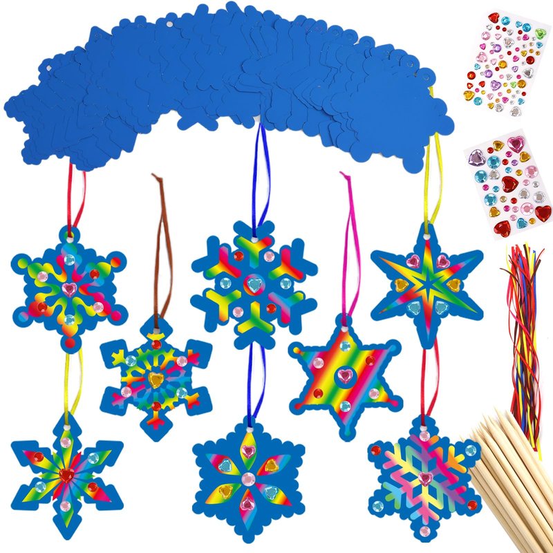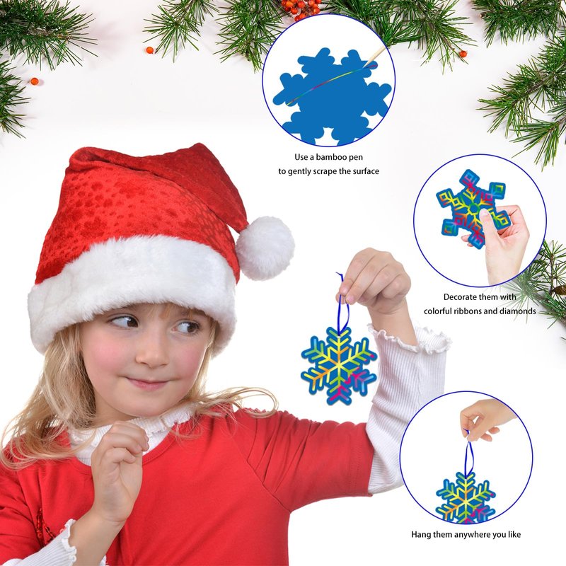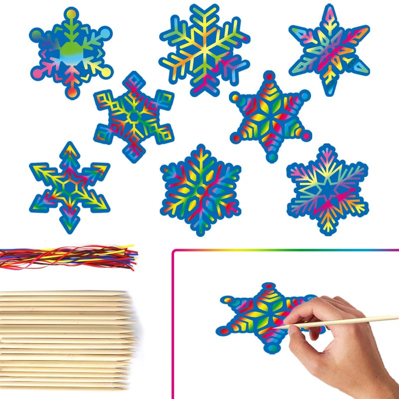 - Package Includes: 32 sets Christmas snowflake scratch kits including 32 Christmas paper scratch snowflakes with satin cords and scratch tools, 2 sheets of diamond stickers for added decoration options, 1 instruction for inspiration, great for kids DIY craft activities