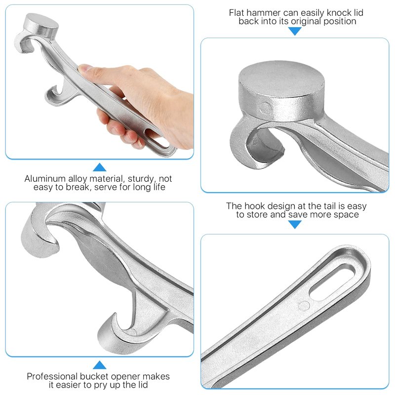 - EASY TO USE: Comfortable handle for increased comfort. Simply press aluminum bucket opener against the edge of the lid pry it up, and repeat the operation on all edges to easily open the lid.