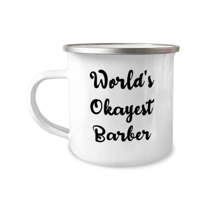 World's Okayest Barber 12oz Camper Mug, Barber Present From Coworkers, Useful For Colleagues, Barber gift ideas, Barber gifts for him, Barber gifts for her, Unique barber gifts, Cool barber gift ideas