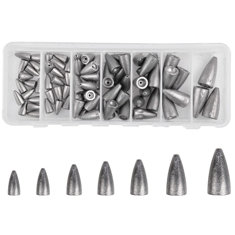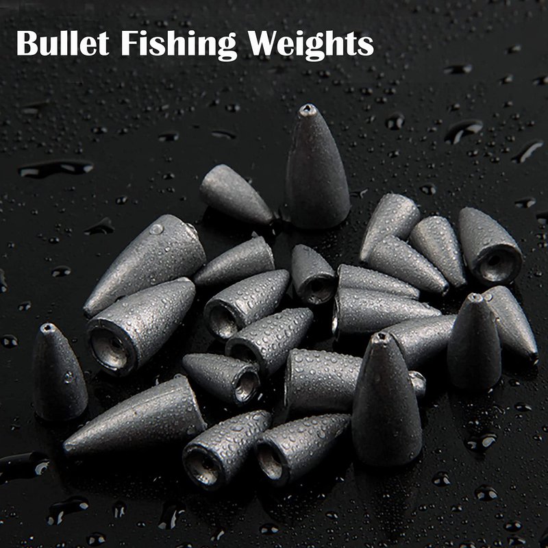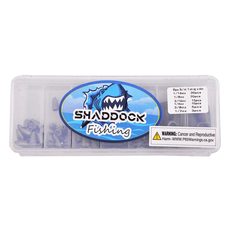 - 83pcs Bullet Sinker Weights Kit contains an assortment of weights in sizes 1/16 OZ-15pcs 1/6 OZ-15pcs, 1/8 OZ-20pcs, 3/16 OZ-15pcs,1/4 OZ-10pcs, 3/8 OZ-5pcs, 1/2 OZ-3pcs