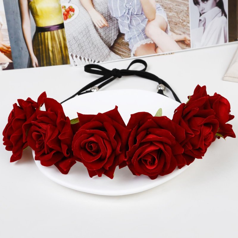 - MATERIAL: This rose flower crown is made of plastic material, so light weight and comfortable. Vivid red rose flower and green leaves make it more beautiful and super cute, and you will get so many compliments on it.