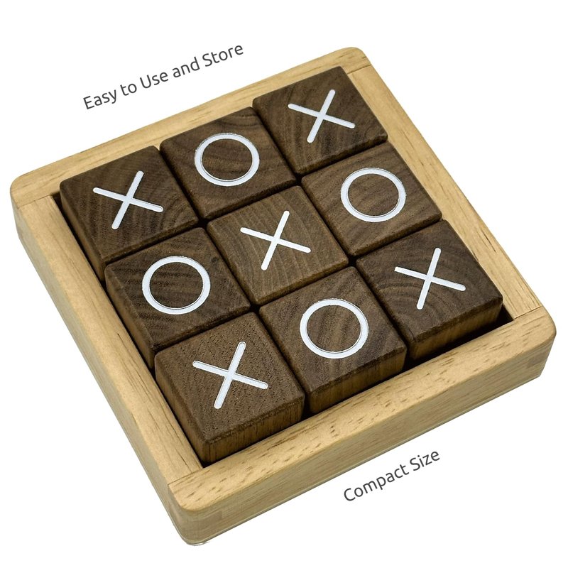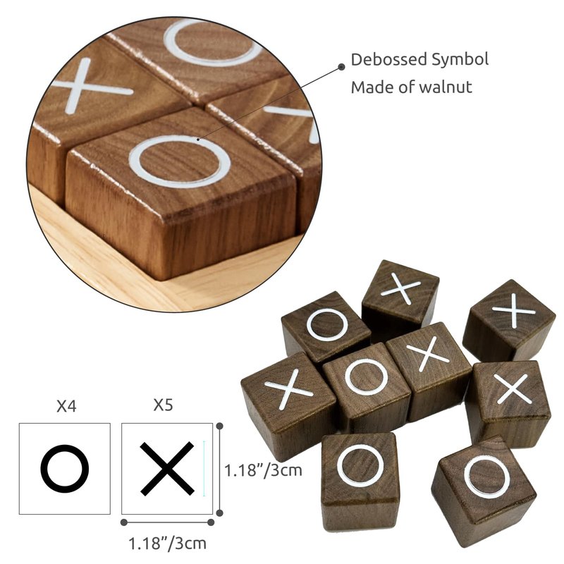 - Wooden XO game: Game tray with 3x3 grid in size 11X11CM. Walnut Game pieces with X or O symbols,each blocks size:3X3CM.