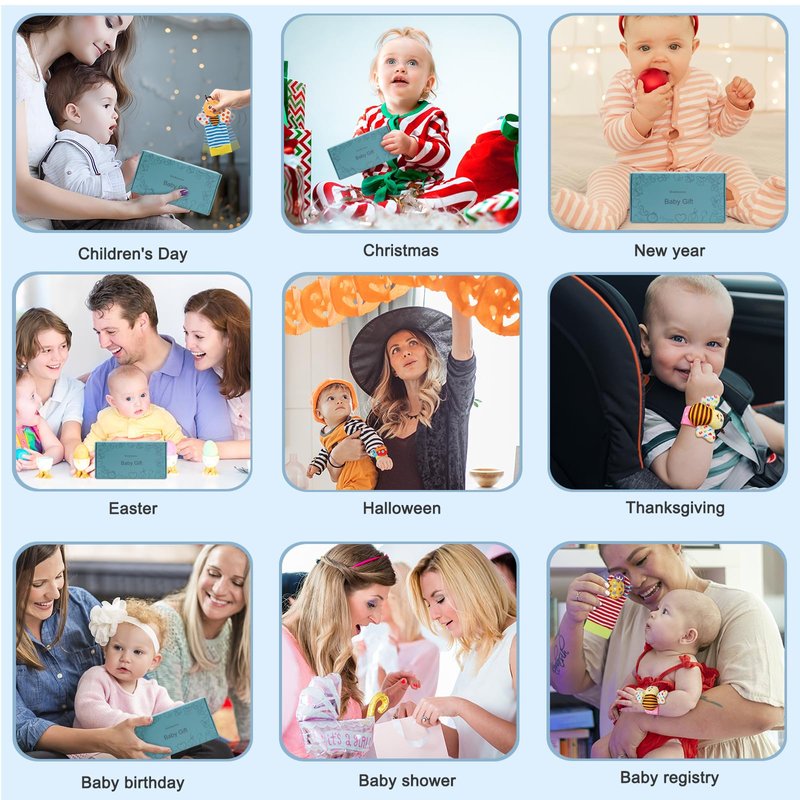 Safe, High-Quality Toys for BabyFor product safety, this toy set is fully tested and had passed ASTM F963-17 & CPSIA certification. Wearable,Adjustable & WashableWrists rattles were with fabric hook, the length on body can adjusted,easy to wear and take off.The rattle toys can wear on hands and foot,baby will not lose them or throw them on the ground.The socks and wrist rattles can be washed (recommended hand washing). Perfect Gifts!Gifts for Baby showers/Baby sprinkle/Sip & See gift/Newborn baby gift/Registry gift/Easter/Halloween/Thanksgiving/Christmas/Holiday gift/Christening gift/'Just because' gift.