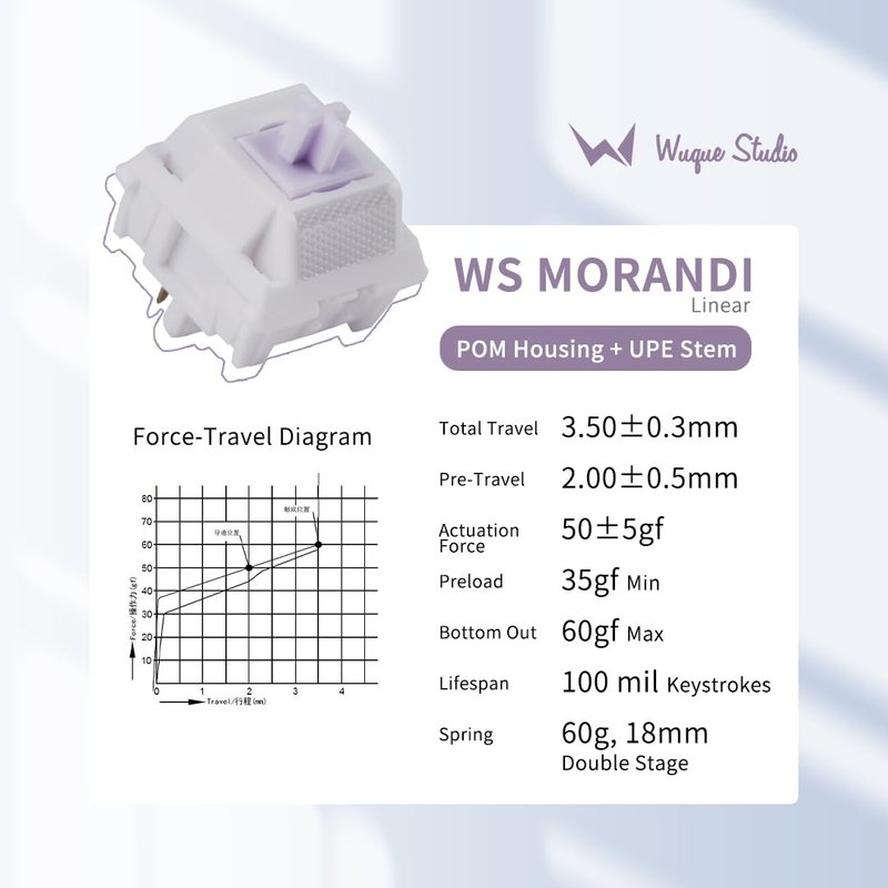 - Switch Type :Linear Top and Bottom Housing Material: POM, Stem Material: UPE, Spring: 18mm/Double stage, Total travel: 3.50士0.3mm, Bottom-out force: 60gfMax