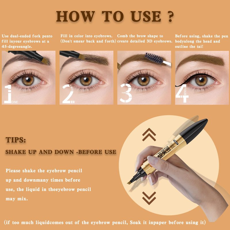 - 【Easy Eyebrow Shaping】 Shake the pen up and down a few times before using. Close the bottle tightly after use! Use a 4-tip micro eyebrow pencil to fill in and blend the color on your eyebrows, then use an ultra-precision tip to fill in the sparse areas and use a double-ended brush to comb your eyebrows into the desired shape.