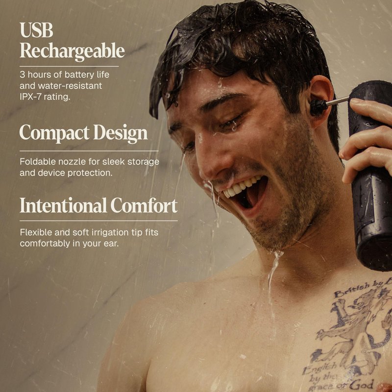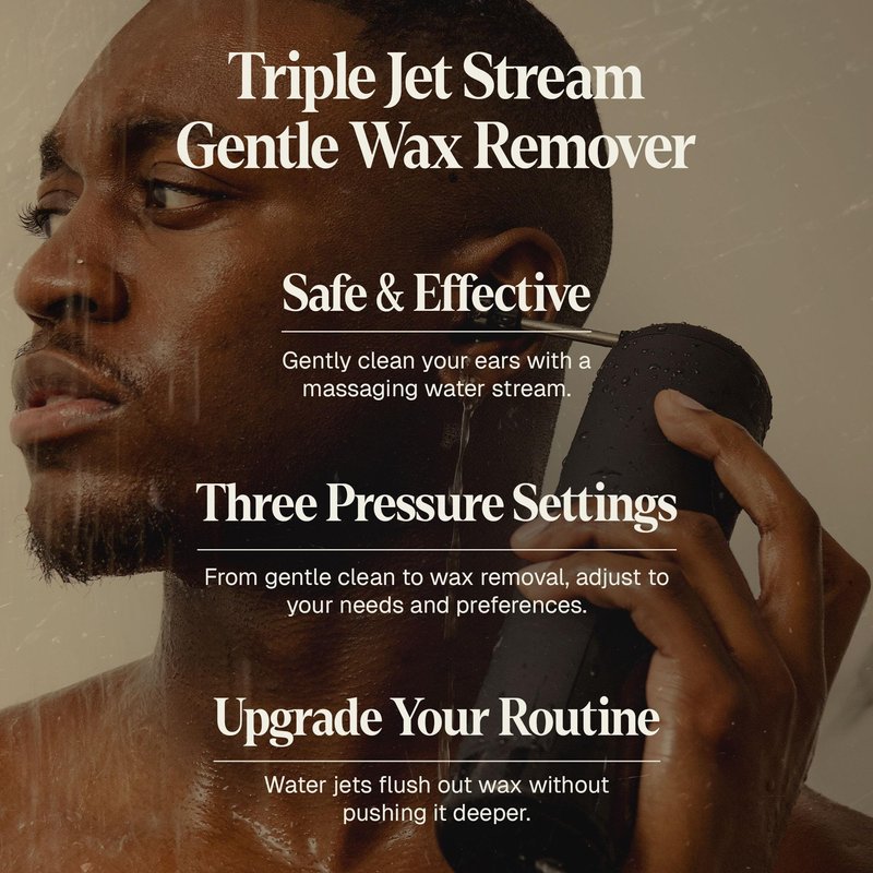 - The Power of Three: Find the perfect pressure for your needs with 3 pressure settings, from a gentle clean to wax removal. Our massaging triple jet stream helps gently loosen and prevent wax buildup. Wush is water resistant and safe to use in the shower. Its flexible, compact nozzle folds down for easy storage.