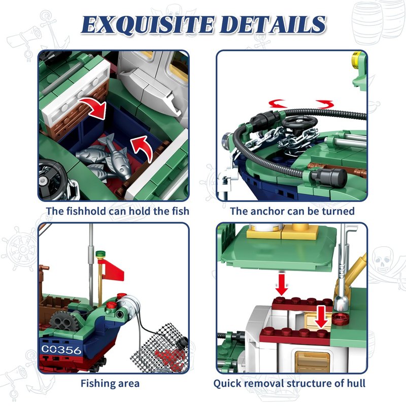 - 🎣【Fishing Boat Building Blocks Set】 Our fishing boat block toy has a cool shape, lots of intricate details and interactive effects such as fish boxes, fishing area, cabin, cab, fishing cageand much more! It's the perfect way to immerse yourself in the world of ocean exploration and create your own exciting works.