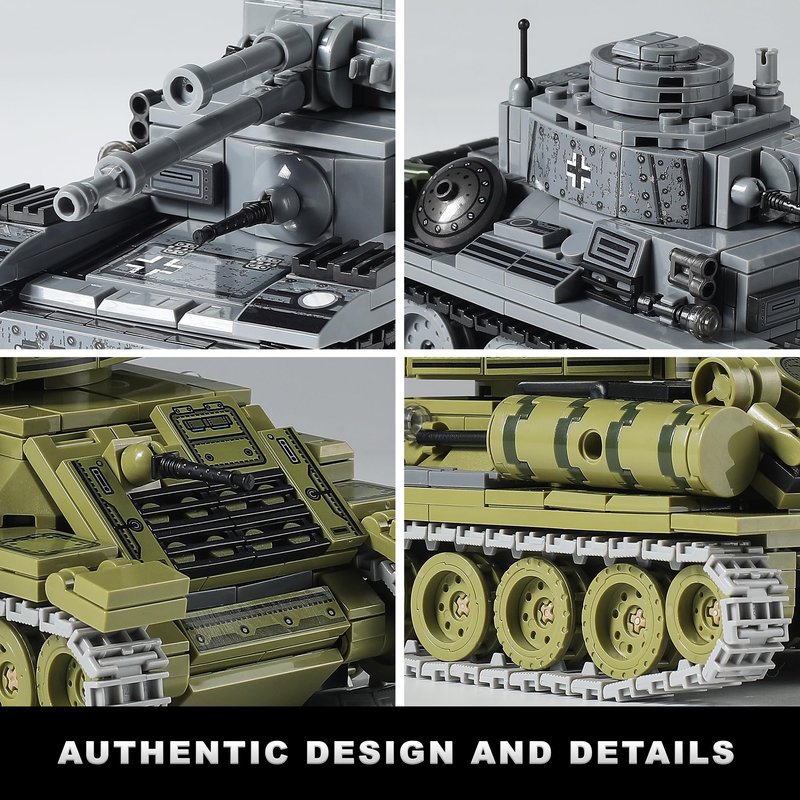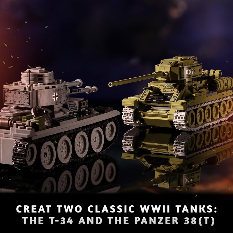 • Based on the iconic German Panzer 38(t) and Soviet T-34 of World War II, this military building set simulates the appearance and armor of two army tanks, highly reproduces every detail, taking you back to the WW2 battlefield.
