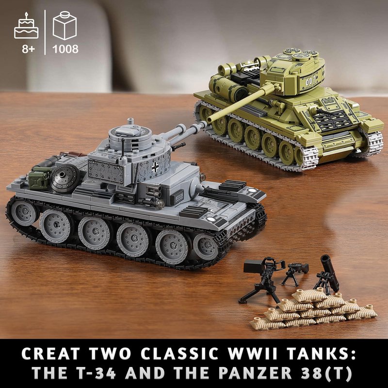 WW2 Army Tanks Toy Building Kit, Create a Soviet T-34 Tank & a German Panzer 38(t) Tank, Great Military Model Toys Gift for Boys, Kids, and Teens Age 8+ (1008 Pieces)