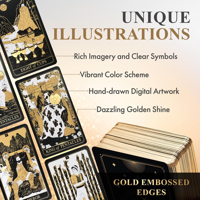 - BEAUTIFUL TAROT DECK - Black and gold tarot deck with guide book and box with gold foil tarot design details. Each card`s front & back has unique gold foil elements, glossy gold edges, and luxe cardstock with a matte finish